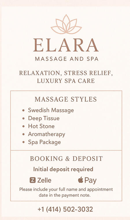 At Elara oriented Massage, I offer a peaceful escape from the stress of everyday life. Whether you're looking to relax, release deep muscle tension, or recharge your energy, each massage session is fully personalized for your body and mind.